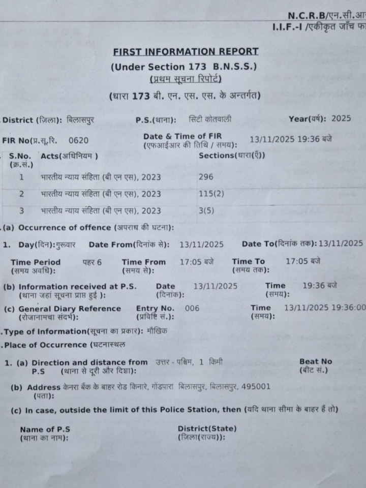 बिलासपुर । सरोज विहार बहतराई रोड निवासी बैंक कैशियर ने शिकायत में बताया कि 3 नवंबर 2025 को ग्राहक विमल सराफ बैंक में अपना स्टेटमेंट मांगने आया था।