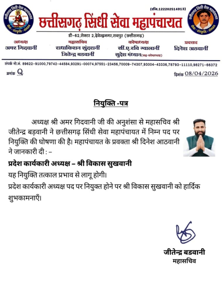 तिल्दा-नेवराछत्तीसगढ़ सिंधी सेवा महापंचायत में संगठनात्मक विस्तार के तहत एक महत्वपूर्ण नियुक्ति की घोषणा की गई है। महापंचायत के अध्यक्ष अमर गिदवानी की अनुशंसा पर महासचिव जितेंद्र बडवानी ने श्री विकास सुखवानी को प्रदेश कार्यकारी अध्यक्ष पद पर नियुक्त किया है। यह नियुक्ति तत्काल प्रभाव से लागू कर दी गई है।महापंचायत के प्रवक्ता दिनेश अठवानी द्वारा जारी नियुक्ति-पत्र में बताया गया कि संगठन को प्रदेश स्तर पर और अधिक मजबूत बनाने, सामाजिक गतिविधियों को गति देने तथा सिंधी समाज की सेवा भावना को व्यापक स्तर तक पहुंचाने के उद्देश्य से यह निर्णय लिया गया है।नवनियुक्त प्रदेश कार्यकारी अध्यक्ष विकास सुखवानी के चयन के बाद समाजजनों और पदाधिकारियों में हर्ष का माहौल है। सामाजिक संगठनों से जुड़े लोगों ने उम्मीद जताई है कि उनके नेतृत्व में महापंचायत की गतिविधियों को नई दिशा मिलेगी और समाजहित के कार्यों में तेजी आएगी।महापंचायत के पदाधिकारियों ने कहा कि विकास सुखवानी लंबे समय से सामाजिक कार्यों में सक्रिय रहे हैं और समाज के विभिन्न आयोजनों में उनकी भूमिका सराहनीय रही है। उनकी नियुक्ति से संगठन की कार्यशैली और अधिक प्रभावी होने की उम्मीद है।नियुक्ति की घोषणा के बाद समाज के वरिष्ठजनों, पदाधिकारियों और शुभचिंतकों ने श्री विकास सुखवानी को शुभकामनाएं एवं बधाई प्रेषित की है। रायपुर सहित तिल्दा-नेवरा क्षेत्र में भी समाज के लोगों ने इस निर्णय का स्वागत किया है।